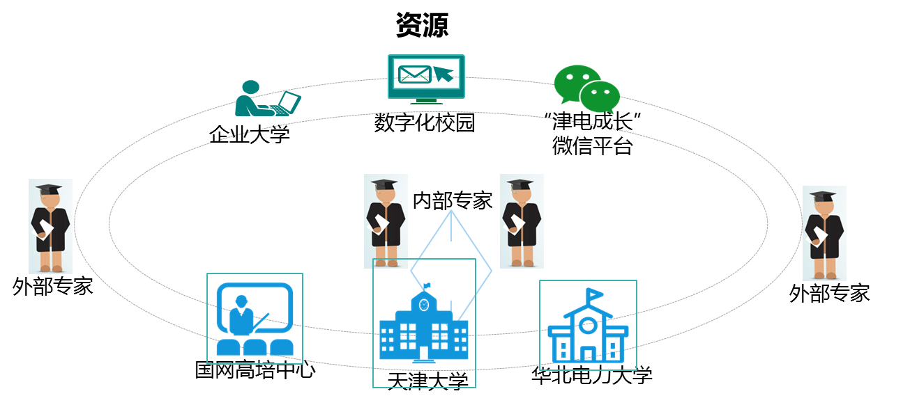 以国网高培中心、天津大学、华北电力大学三大合作平台为基础,结合公司内部数字化校园、企业大学、网络大学、津电成长平台,汇聚内外部专家人才资源,整合“四位一体”模式合作平台及资源,开展城市能源互联网成果提炼、案例开发、课件编制等工作。