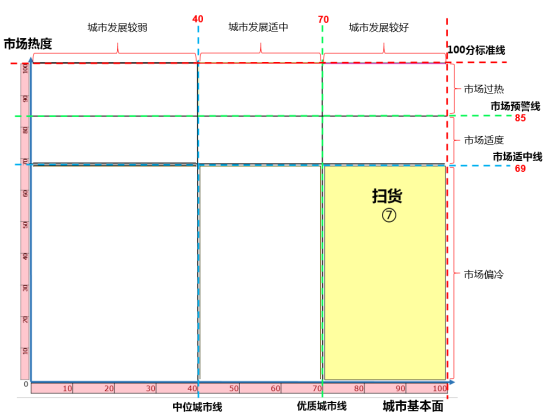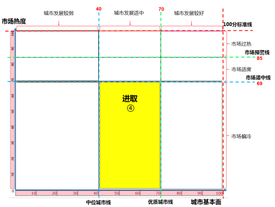 该区域城市基本面较弱,市场热度较低,房地产市场整体处于平淡期,风险偏小,在某些细分市场如高端市场,存在一定市场需求;需要通过审慎挑选高性价比的优质项目实现城市进驻。