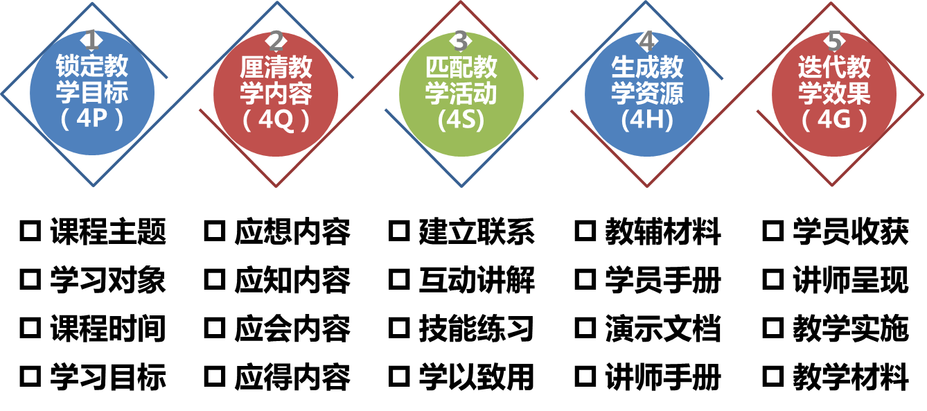 第四步,生成教学资源。将教学内容及教学活动呈现出来,属于教学资源开发范畴,回答“有何物”的问题。教学资源主要有四个方面的组件,简称4H(Have),分别为H1讲师手册、H2学员手册、H3演示文档和H4教辅材料。