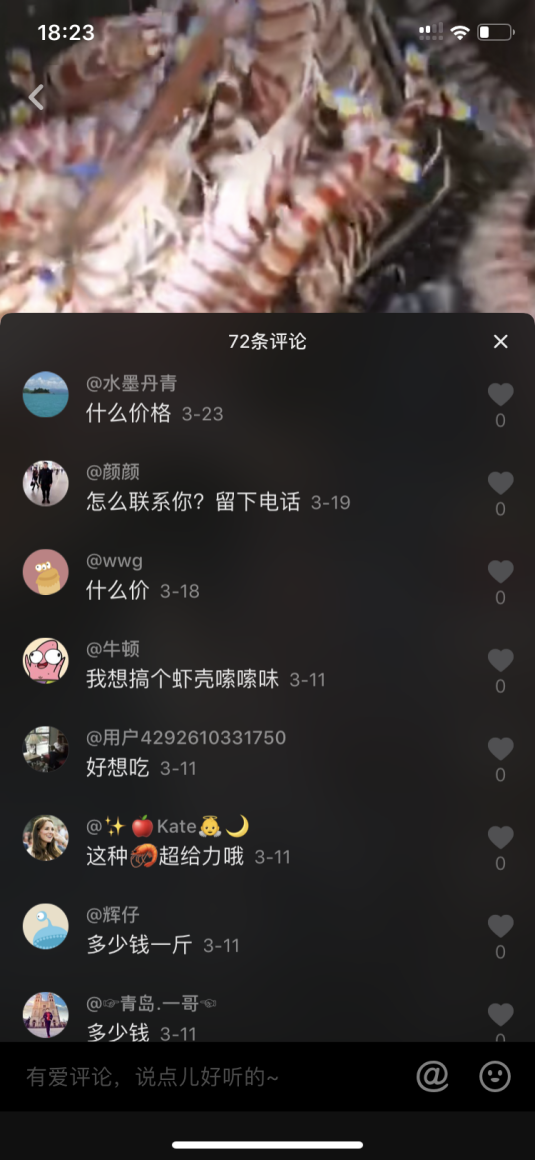 一个出海捕捞的渔民,经常在抖音里,晒自己出海捕鱼的视频。图1-6是拍摄的刚捕捞出来的斑节虾,在船舱活蹦乱跳。视频的主人随口说了一句“最新鲜的斑节虾,刚捕捞上来,想吃的朋友留言”。下面立即就有询问价格、怎么购买的用户。