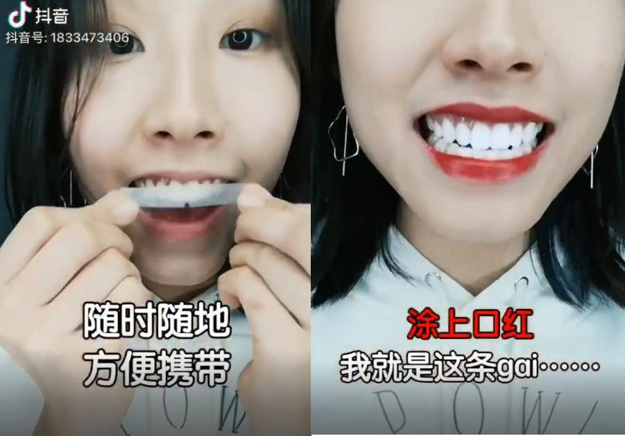 有一个牙贴厂家在抖音做广告推广,拍摄了这样一个视频:模特贴上了一款牙贴产品(树脂贴面是在牙齿的外面贴上一层与正常牙齿颜色相近的树脂材料,遮住牙齿本身的颜色),半个小时候后,牙齿白如瓷片,如图1-7所示。结果这款牙贴一个月销量高达上万单。