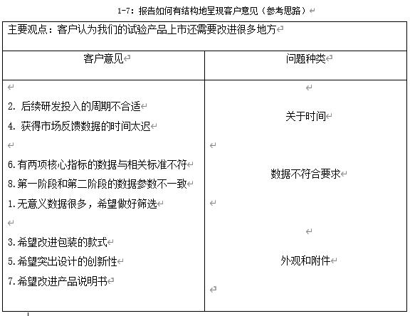 还记得前面我们学了纵向结构和横向结构,这个时候,要把知识串联起来运用。如果你偏向纵向结构思考,那么你就先提炼出核心观点,再去寻找相关论据,理清其中的逻辑顺序。比如,我们提炼出核心观点是“客户认为我们的试验产品上市还需要改进很多地方”,再去寻找论据,客户为什么会这么说;如果你偏向于横向结构思考,那么你就从具体要素出发,从每个要素里面寻找关键词,寻找各要素之间的逻辑关系和逻辑顺序。比如2和4,关键词“投入的周期”“时间太迟”都与时间有关系,他们就可能会归为一类。不管用哪种结构来思考,最终我们把思路整理好,再以从上至下的金字塔结构呈现出来。