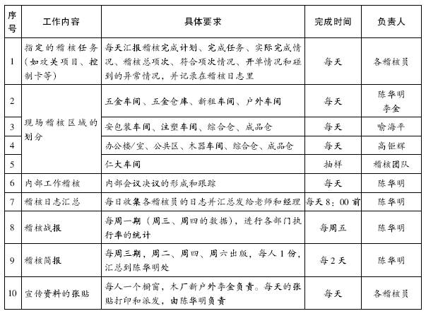 责任:以上两项工作列入各稽核员考核数据里面,未按期完成的按规定主动承担责任。经理和老师可以根据工作状况临时调整工作安排。