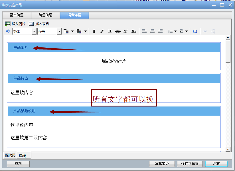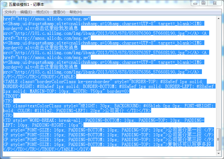 还有一个简单方法,那就是打开阿里巴巴商机助理,然后再打开编辑详情——源代码(先复制文档的代码,然后粘贴到源代码中)——编辑。在编辑里面我们就可以看到成品的代码(如图3-12所示),这里的文字和背景颜色都可以改变。如果不会变颜色,可以改变成我们需要的文字,或者改成客户喜欢的顺序。