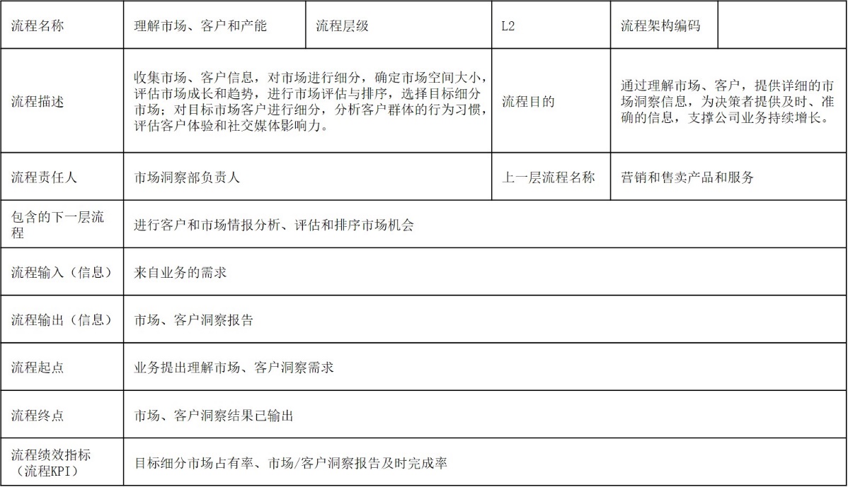 流程架构说明文件(流程卡片),前面对其作用已经做过说明,其对于流程架构的分解、具体流程建设的重要作用是再怎么强调都不过分的。基于这一点,选择了上述图4.12营销和售卖产品和服务流程架构中一个L2模块“理解市场、客户和产能”模块做一个通用版的流程卡片作为示例,如下图所示: