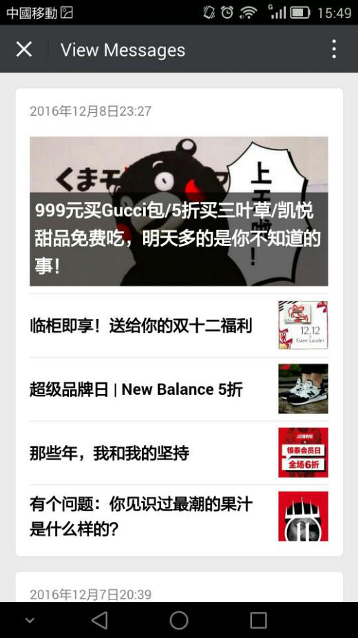 其次,是内容的表现形式。从选题、定题、标题包装创作、内容支撑(大促、特卖、干货信息)、内容表现(图文影音)等方面,均要求进行系统性的统筹操作。如何提高内容的整体格调呢?多关注一些高格调的公众号,重点了解他们的运营逻辑与表现手法,先模仿,再创作。久而久之,公众号内容的格调及魅力自然可以得到逐渐提升。