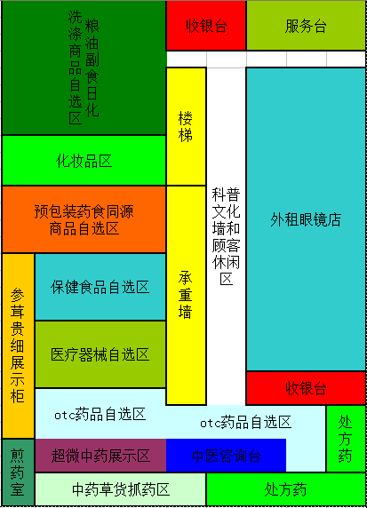 一个位于二楼的药店示意图(如图1所示,改造前的陈列区划图),总面积接近1700平方米,药店净面积1000平方米。楼梯入口位于店堂近中央位置,又有承重墙将整个店堂几乎分成两半,整个店型狭长且不规则。原陈列将药店最吸客的中药和处方药放在最里面,然后沿楼梯口后左拐方向依次陈列副食、日化、洗涤用品、化妆品、药食同源商品等。