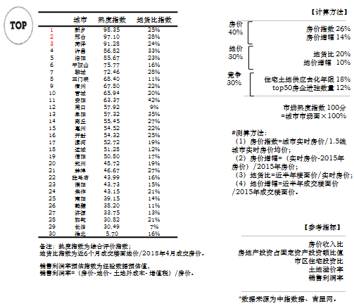 从销售利润率看,大于25%的城市有6个,为郑州、开封、南阳、长治、聊城、邯郸;20%-25%的城市有6个,为平顶山、鹤壁、濮阳、晋城、淮北、蚌埠。销售利润率=(房价-地价-土地外成本-增值税)/房价,土地外成本按3600元估算。增值税=(房价-地价)*10%/(1+10%)-3600*8%。需要注意的是:销售价格为2018年4月份价格,楼面价为近6个月成交楼面价,上海、杭州土地外成本按5500元/㎡测算,江苏及浙江其他城市4500元/㎡测算,安徽省各市按照3600元/㎡测算。