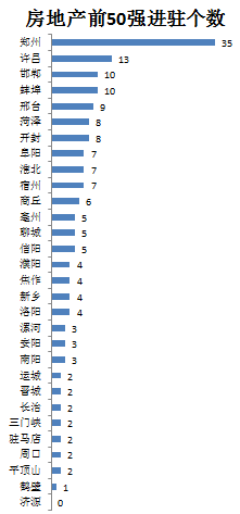 郑州、许昌等城市TOP50房企进驻较多,市场竞争十分激烈;3个城市已经有10家以上TOP50房企进驻。