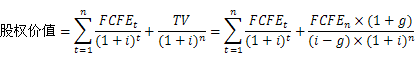 式中,假设预测期共有n期,预测期最后一期股权自由现金流为,永续增长率为g,权益要求的回报率为