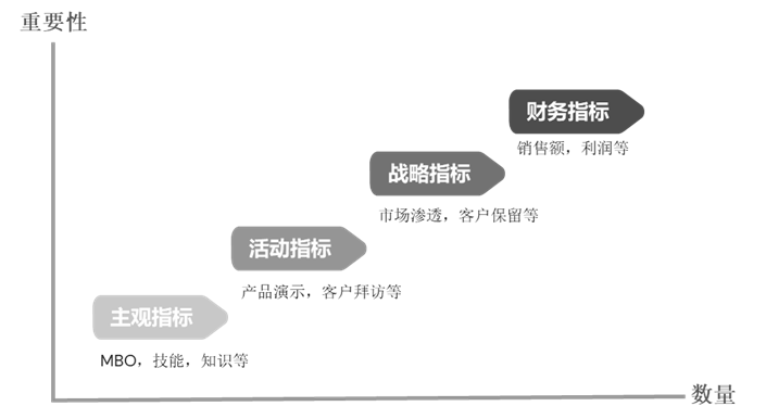 此外,在销售周期较长,或者难以衡量典型销售财务或战略指标的情况下,也可以使用销售活动指标。例如,某大型中央空调制造企业的产品销售通常与大型基建项目相关,销售周期可以长达数年。企业将获得投标资格作为关键里程碑,设定为销售人员的一项绩效指标。销售活动指标不是考核销售人员的核心指标,通常不推荐使用。许多销售活动指标的作用可以通过销售竞赛和特殊销售激励方案(SPIFF)实现。
