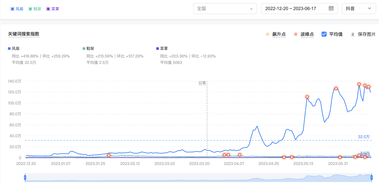 进入抖音巨量算数,通过比价3款商品的关键词进行搜索趋势分析,如图7.3所示,调出近半年的搜索趋势,风扇的增量和整体趋势是最好的,这个商品可选。