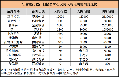 三只松鼠、良品铺子、百草味,都是品类里的佼佼者。快营销指数也真实地反映出他们实际情况。作为坚果零食的领导者三只松鼠则在电商体系,绝对领先;IP知名度也是最高的。而像百草味通过和京东的深度合作,并在阿里巴巴平台重磅发力,也取得了良好成绩。良品铺子则是线上线下同时发力,由于其在线下拥有2000家店,良品铺子的线下优势遥遥领先。