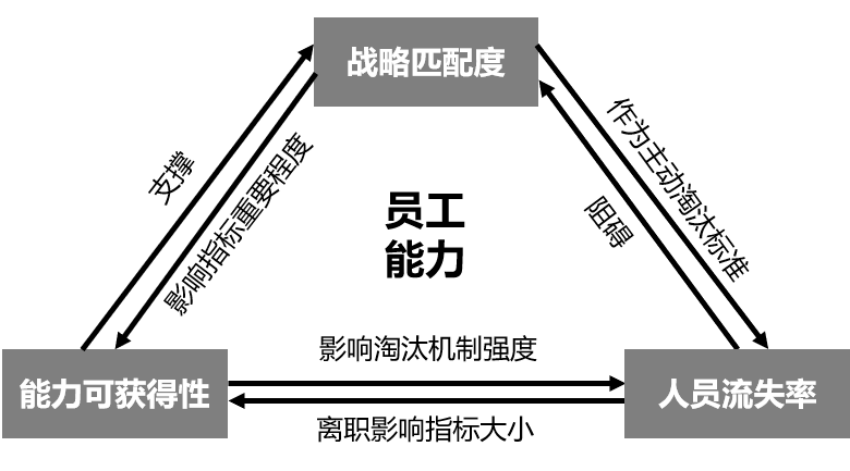 员工能力是指员工具备的支撑企业战略及业务发展的能力。员工能力不仅要识别当下的能力现状,明确与战略所需核心能力的匹配度,还要对能力进行有效的动态管理,增强新能力的可获得性,同时避免因为人员流失而造成的能力缺失。通过战略匹配度、能力可获得性及人员流失率三个指标反映员工能力的现状、获取和流失,帮助企业进行有效的闭环管理,确保员工能力对组织的可持续高效支撑。如图6-28所示。