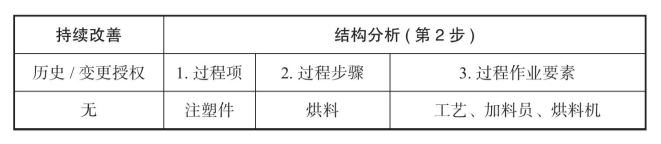过程步骤是写公司的生产工序,过程项是写本公司的半成品或成品,比如公司是做汽车旋钮注塑件的,过程项就是注塑件,过程作业要素是工序中影响品质的要素,比如人、机、料、法、环。如表2-3所示。