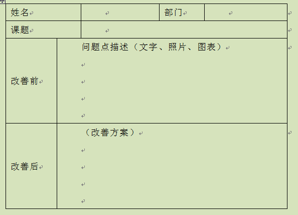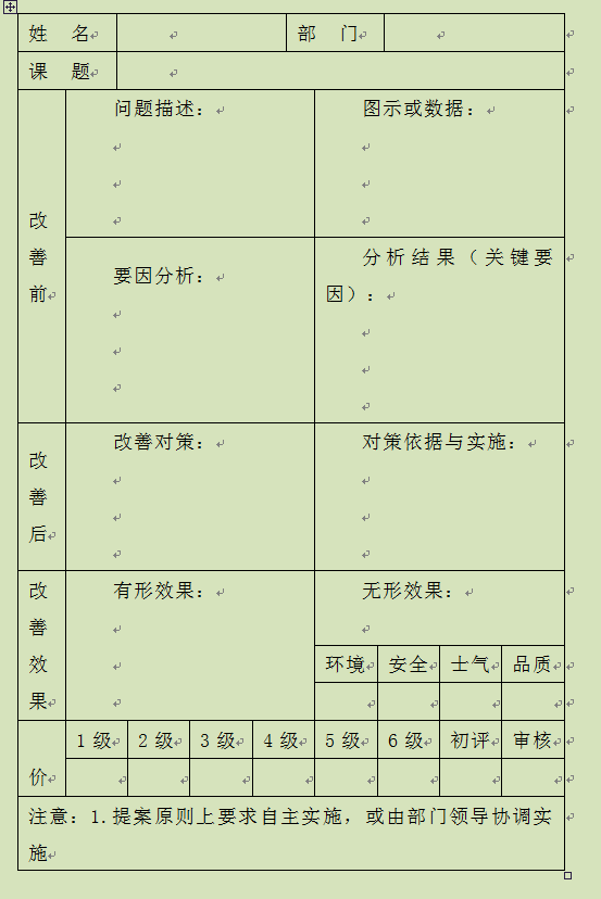 有些简单的小提案、问题和改善措施都十分简单明了,只要一句话就能够说清楚的,使用此表不仅实用而且高效快捷。