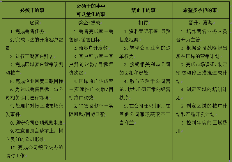 从表4-4中可以看出,将员工“必须要做的事”对应底薪考核部分,其中可以量化的指标则列入奖金和提成的考核部分。另一方面“希望员工做的事”对应员工晋升和嘉奖的标准,“禁止员工做的事”则成为对员工的扣罚标准。