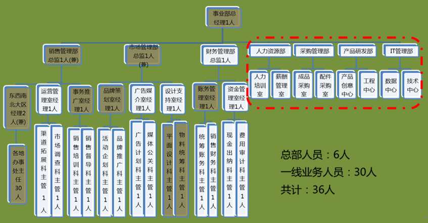 然后依据这个原则,对三年的组织规划做一个总体的设计,再按年份调整和补充每个岗位的人员,以某企业设计的下辖事业部三年组织架构图为例,进行演示,如图4-3、图4-4和图4-5所示。