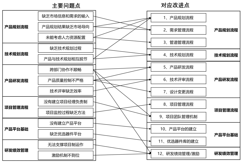 ​ 在产品研发层面,针对典型的产品研发流程,着力解决跨部门协同关系,同时改善项目管理机制,提高研发流程和研发项目的运作效率;