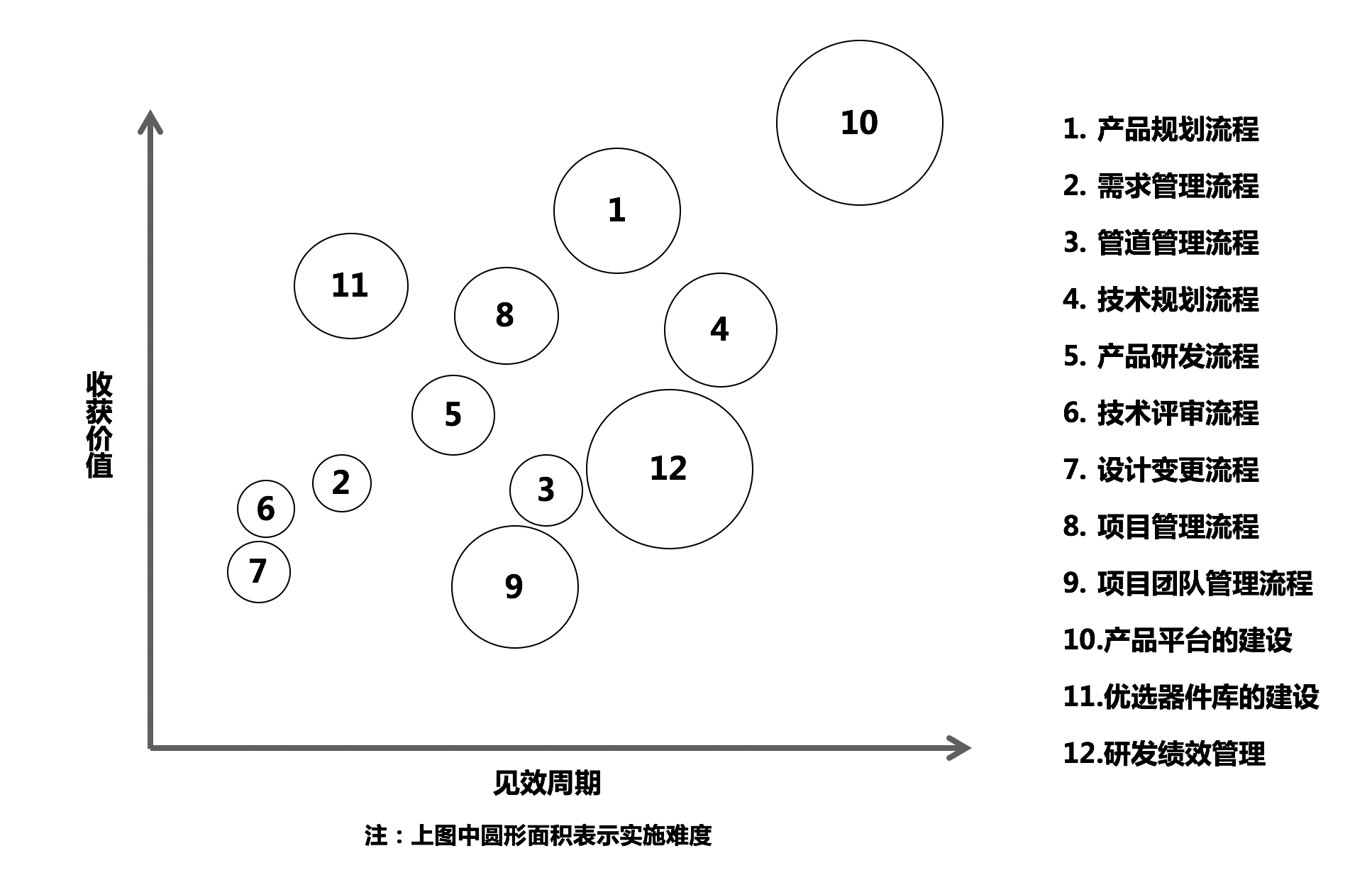 从收获价值、见效周期和实施难度三个维度评估各个改进点,将全部改进点绘制在一张图中。如图3-12所示。