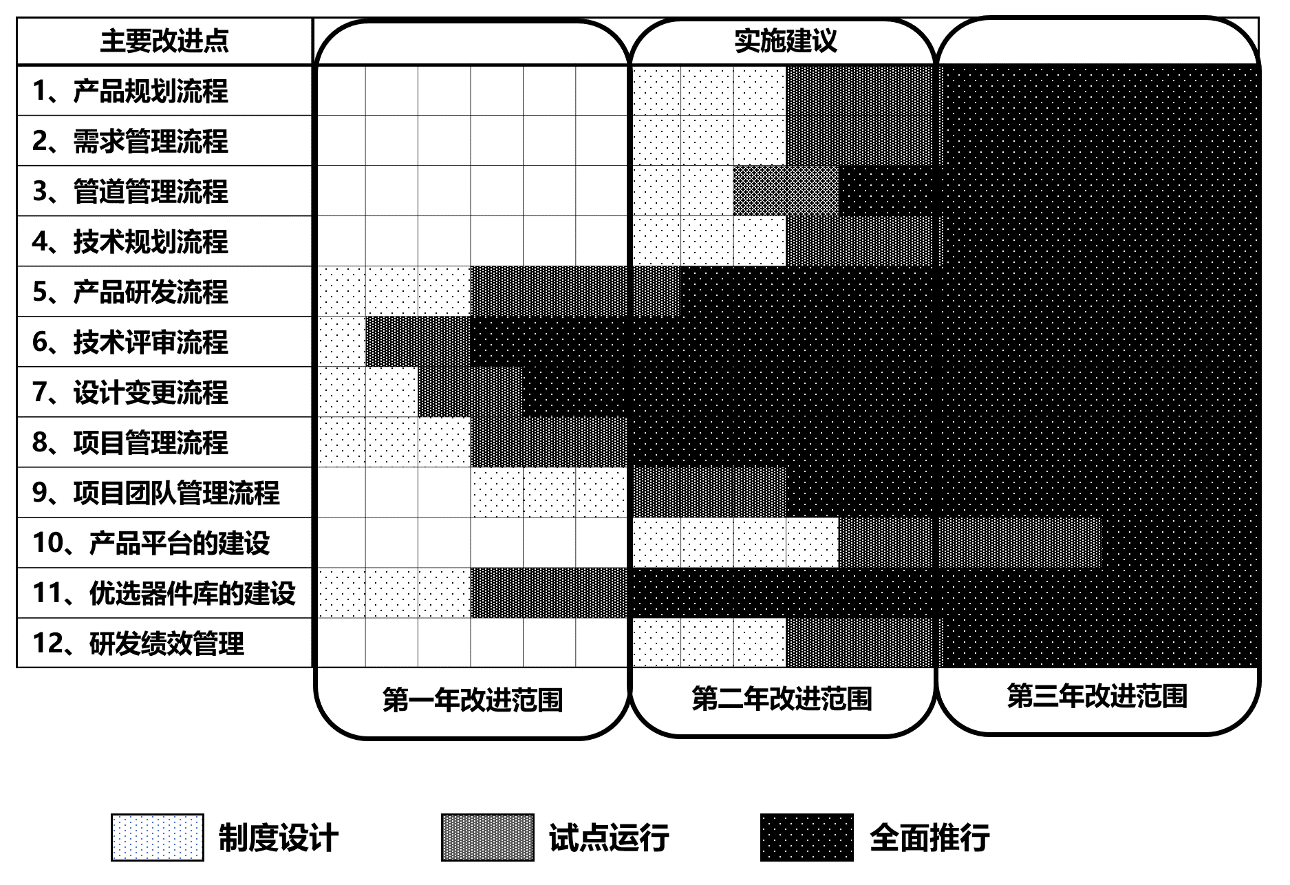 考虑到企业的资源投入和承受能力,采用“总体规划,分步实施”的策略提出解决方案。问题是对这12个改进点,如何进行优先级排序?