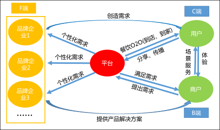 互联网平台渗透传统渠道已经很深入了,现在开始渗透餐饮渠道。餐饮渠道相对比较难整合进新零售,餐饮企业对食材的存储、运输要求非常高,传统的供应链系统暂时无法满足餐饮企业的发展所需。所以,现在一些互联网先通过与品牌商或经销商合作,从比较容易拓展的餐饮中小店开始,通过品类组合优势,为餐饮门店前厅提供一站式产品解决方案,从而获得流量和流水。与此同时,通过自建仓库货、冷库,打通供应链系统,逐步对餐饮前厅产品和后厨食材进行打包。在对线下普通餐饮进行包抄后,逐步转向中高档餐饮拓展,最后形成互联网平台为餐饮门店后端提供供应链服务,前端为消费者提供门店筛选、决策、消费、支付、点评等消费闭环。通过数据洞察,为餐饮门店提供精准供应服务,每个周期需要供应什么、需要供应多少量、门店的选址、人群的聚焦、消费者画像、开什么类型的餐饮店等,为餐饮企业提供一揽子生意解决方案。互联网通过前端消费者画像信息,根据消费者所需,将信息传递给各品牌企业,品牌企业根据消费者所需,为餐饮企业定制化产品,为消费者提供个性化产品服务。互联网将与品牌企业打造共生共融的生态圈,进一步缩短中间供应链环节,使消费者触达产品效率大为提升。如图13-4所示。