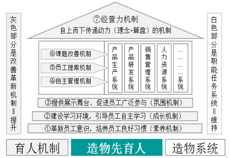 综上所述,职能任务系统关注的是物,是“造物系统”,而7大提升机制关注的是人,是“育人机制”,这恰好契合了“造物先育人”的先进理念。由此,育人机制与造物系统相辅相成,构成一个立体的、可持续发展的自主创新经营体系。