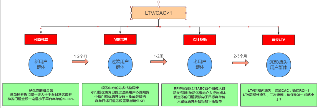 ​ 品类、品牌、单品优惠券介入控制成本。经历过3~4次后的用户品类属性有了初步的模型,这时需要抓住品类偏好,单一品类适用券,折扣成本就更好把握。同时,有和供应商谈判的空间,供应商承担部分比例。