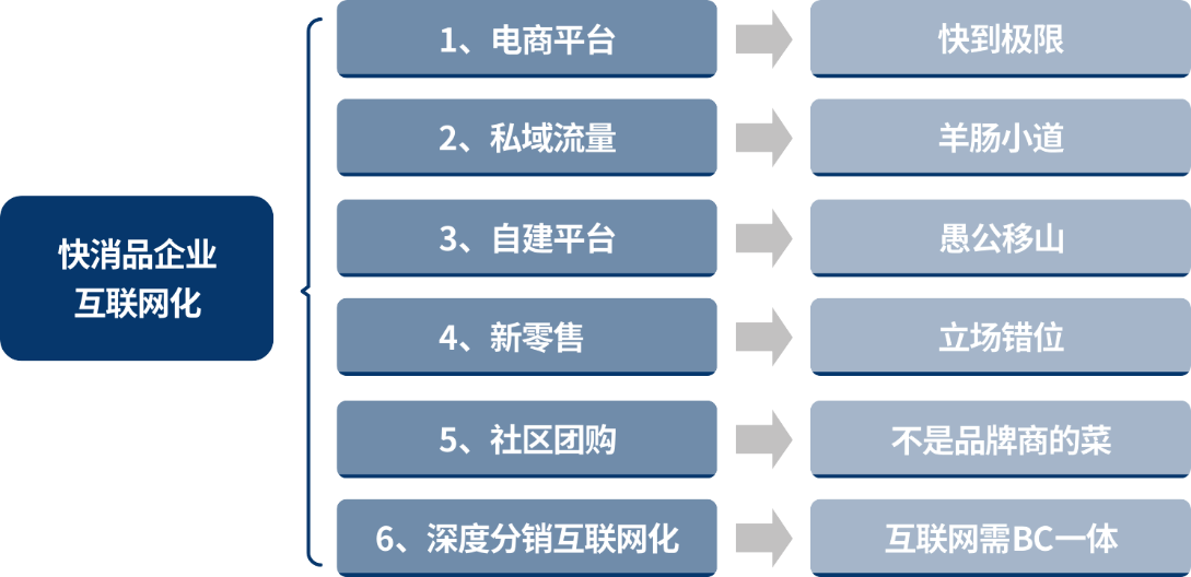 第一条路径:走平台电商之路。根据国家统计局公布的2019年社会零售商品总额的数据,电商2019年占中国社会零售商品总额的23.1%。这已经接近电商的份额极限,而且平台电商并非快消品的主渠道。所以,电商并非快消品企业互联网化的主流路径。
