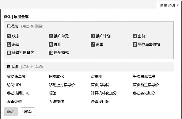 每个账户使用者可以根据自己的工作需要和喜好,有选择地列出不同的属性。比如我列出了展现量和点击量,就不用列出点击率,因为点击率=点击量/展现量。值得一提的是【访问URL】这个参数,其实百度可以为每个关键词设置不同的着陆页面,但我的建议是为了便于管理和分析,所有的着陆页面都应当在单元层级上设置。这样设置的结果是一个企业的广告账户顶多会有几十个着陆页面(有多少个单元就有多少个着陆页面);如果放在每个关键词上设置,就会产生几百上千的着陆页面,不容易管理,更不容易分析。