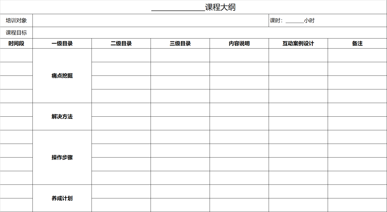 我们先看表8-2中的一级目录,我在上面表中把一级目录填到里面了,这就是内容设计里的四个部分,当然名字是要改的,内容就是这几方面。也就是说,通过四个部分的内容设计来实现培训的目标,怎么实现的?通过痛点部分让学员了解到目前状况对于自身的限制,认同要通过学习改变现状。为什么是挖痛点的方式呢?因为痛才使人愿意做出改变,而且意愿更强烈,就像很多人为什么能下定决心减肥,往往不是因为减肥后更健康、更美丽,而是因为别人异样的眼光、相亲失败、工作受阻等让人痛苦的原因才改变的。