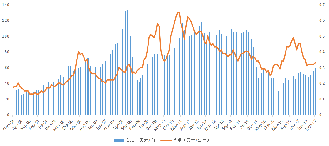 图17-1 国际食糖与石油价格走势比较