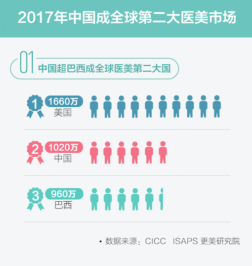 《2017中国医美行业白皮书》显示,2015年中国医美市场仅以0.8%的微弱劣势低于巴西,随着中国医美发展进入“快车道”后,2017年中国医美增速超40%,总量超1000万例,标志着中国超过巴西,正式成为仅次于美国的全球医美第二大国。