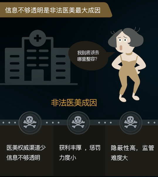 《2017中国医美行业黑皮书》分析非法医美的主要成因包含医美权威渠道少、信息不够透明、非法医美获利丰厚但惩罚力度小、非法医美隐蔽性高以及监管难度大等。
