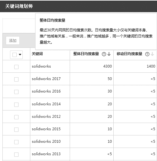 但“solidworks 2017”一词(中间有空格)在这些数字上就显得比较合理,在【搜索词报告】中的展现量是637次,日均21.3次,要小于在【关键词规划师】中的日均搜索量的50次。这是因为【搜索词报告】只是一个企业搜索推广账户的数据,而【关键词规划师】是整个百度的数据,肯定要大。