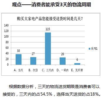 做消费者问卷调查的时候,每个人的选择不同,这就需要将数据统计出来,然后统计出结果(如图2-15所示)。调查问卷中的第4个问题“购买大家电产品,您能接受的送货时间是几天”,那么大部分人会选择三天内,因而可以得出结论,消费者能够接受的送货周期为三天。