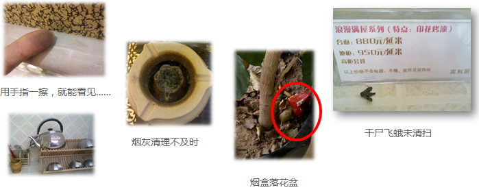 店面卫生是店面运营的基本要求,而大部分店面对卫生保持的不够。如图2-16所示,墙面有灰尘,烟灰缸未及时清理,花盆中有烟盒,台签前面的飞蛾尸体未及时清理,这些正好说明店面的运营管理水平处于初级阶段,缺乏店面检查制度和店面监督制度。这样的结论需要通过图片的形式才能说明。