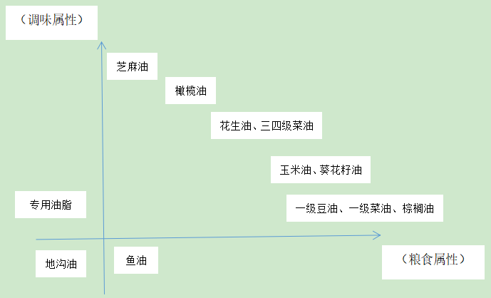 各种食用油,它所拥有的粮食属性和和调味属性权重是不同的。以芝麻油为代表的调味油,调味属性极高,粮食属性可忽略不计。豆油、一级菜油和棕榈油则主要用做粮食,调味属性较低。居于这两者之前的花生油和三四级菜籽油,调味和粮食属性并重。一般来说,价格越高的食用油,调味属性也越高。反之,价格越低的食用油,粮食属性越高。粮食属性或调味属性为负值的食用油产品例外,如地沟油等,它不属于合格产品的范畴。