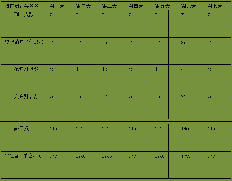 还是沿用第一节的数据,如果要拜访完7个小区,每个小区600户,要求临促人员敲门率100%,入户数50%,送达“开门见喜”装修红包率30%,登记消费者信息数20%,跟踪到店率5%7天共计划招聘4名临促人员,每天进行日报工作,请确认每天每个临促人员的工作量。