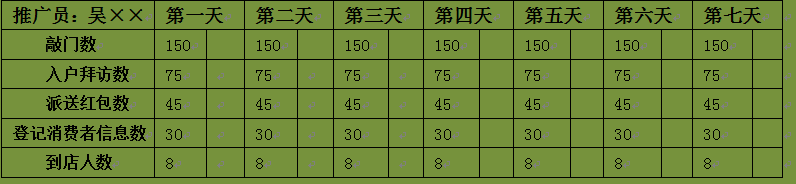 第三步:则我们要求以日为单位,检查临促人员每人的工作完成情况,每天敲门150户、入户拜访75户、派送“开门见喜”装修红包45户、登记消费者信息30条,最终跟踪到店人数8人。