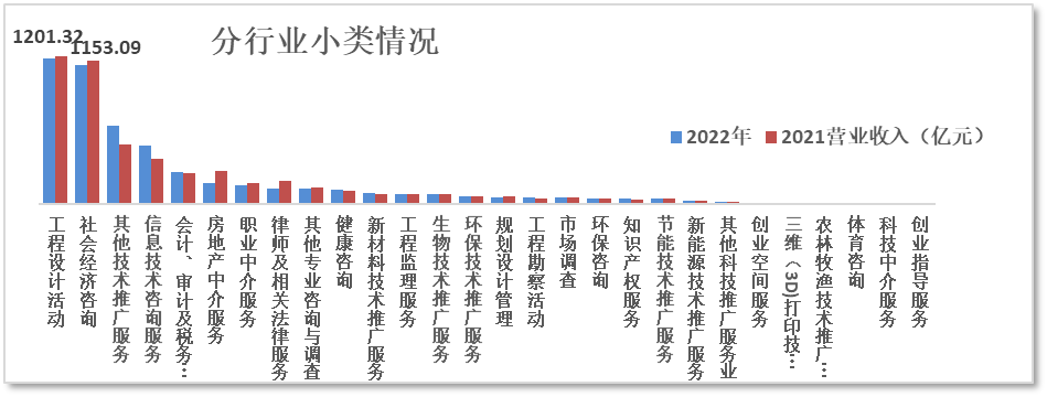 2022年上海市咨询业(规模以上)按行业小类分,工程设计活动和 社会经济咨询仍排名前列,分别为1201亿元和1153亿元,远大于其他咨询小类一个数量级,奠定了工程咨询和管理咨询的基数(见图3-4)。