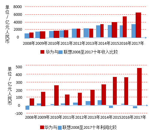 图2-24 2008年至2017年联想和华为收入与利润对比图