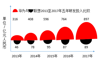 2013年华为研发投入额是联想的五倍,到2017年已经接近十倍,两家企业在研发上投入的不同反映了不同的发展路线。