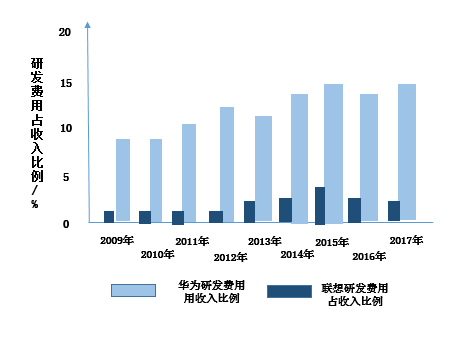 图2-26 华为、联想2009年至2017年研发投入与营业收入之比