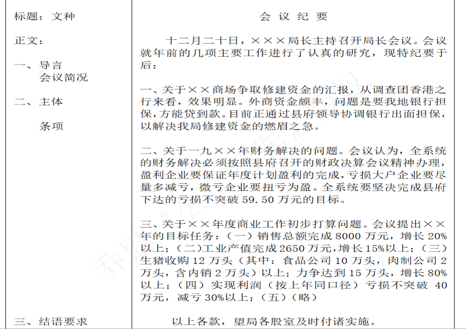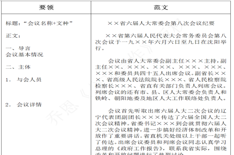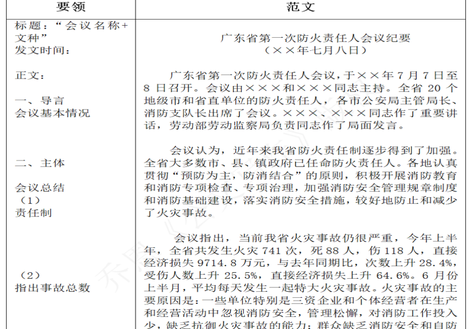 纪要内容:发言顺序方式;条款分列方式;综述概括方式。主要是反应会议的主要内容和成果。
