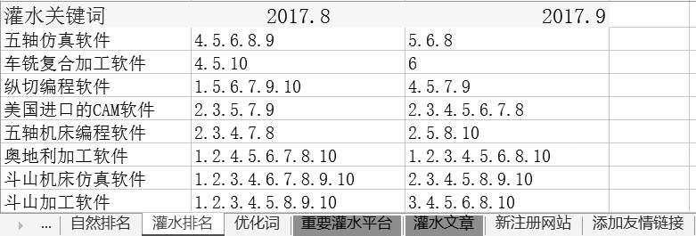 注解:由于灌水的长尾词数量大,建议每月统计一次,有多条信息排名时,用小数点隔开。如表7-11所示,第二条数据在2017年8月的排名:4.5.10意思是搜索“车铣复合加工软件”时,在百度搜索结果的第4名、第5名和第10名都是这家企业的灌水信息。