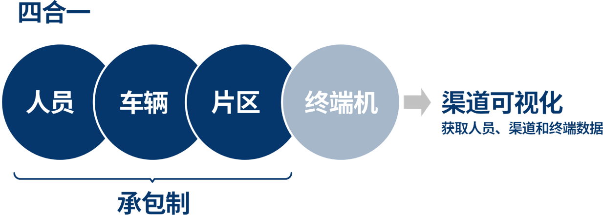 “四合一”模式有两大亮点:一是激活“小工”,通过“人、车辆、片区”的组合,把“小工”变成一个利润单元,类似于“包干制”,调动“小工”的积极性,让“小工”为自己干而不是为老板干;二是通过“终端机”带来的数据化,提升分销效率。