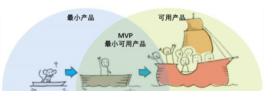 下图是对MVP的形象化解释,左侧是“最小产品”但对人而言船太小了,有点类似于直接去地铁里卖橙汁,很可能不是“可用产品”;右侧则是“可用产品”,类似上文的设计制造机器;中间才是“最小可用产品”,即租赁机器进行售卖测试。
