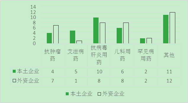 优先审评的目的之一是要加快具有临床价值的新药上市。从过去一年创新药优先审评分布来看,本土企业与外资企业旗鼓相当,品种数量都是38个。说明外资企业和本土企业抓政策红利能力不相上下。如图2-4所示。