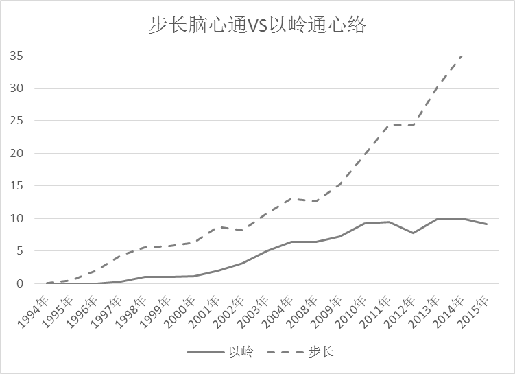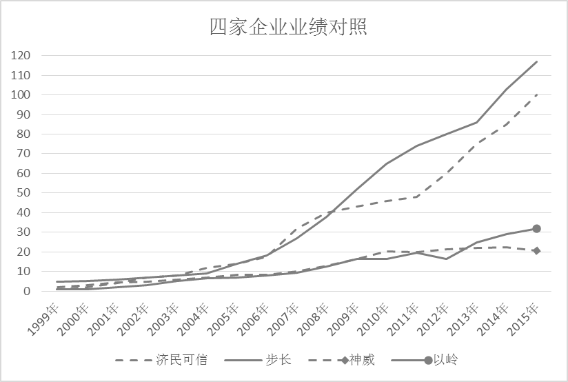 下面我们以步长制药、济民可信、以岭药业、神威药业四大知名中药企业为例,回顾四大药企的发展史,探究组织裂变是如何推动业绩二次成长。这四大中药企业都起步于20世纪90年代中期,应该说起步阶段大家的基础都差不多。但随着时间的推移,四大企业的发展轨迹开始分化,步长和济民可信两家企业的业绩明显高于以岭和神威,前两家企业呈现的指数型增长,后两者呈现的是线型增长,如图6-3所示。我们需要深入探究的就是什么原因导致了四大企业的分化。